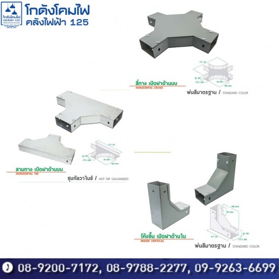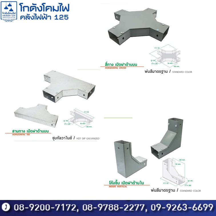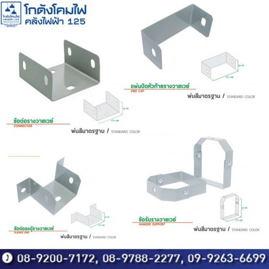 จำหน่ายอุปกรณ์ประกอบติดตั้งรางไวร์เวย์เหล็ก ได้แก่ งอฉากเปิดด้านบน งอฉากเปิดด้านใน งอฉากเปิดด้านนอก สามทางเปิดด้านบน สี่ทางเปิดด้านบน ตัวแขนราง ขนาดลงตัวกับขนาดราง